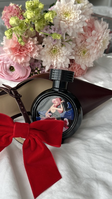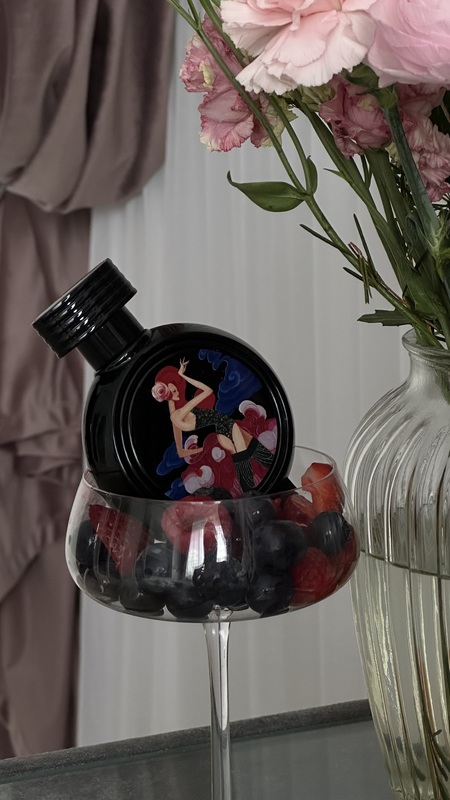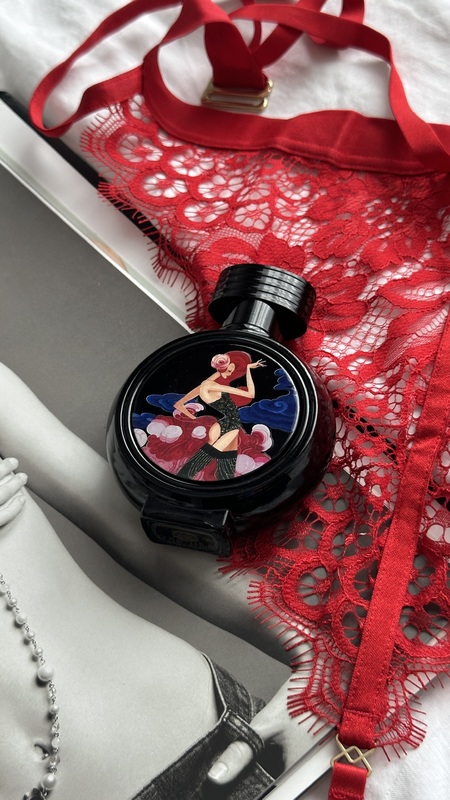 Флакон — как плакат к кабаре: чёрный круглый корпус и картина с женщиной в блеске, в вихре розовых перьев, на фоне ночного неба. В этом образе соединились дерзость, женственность и театральность.