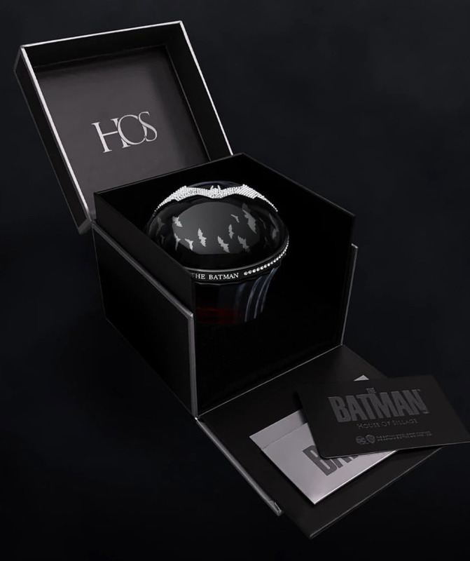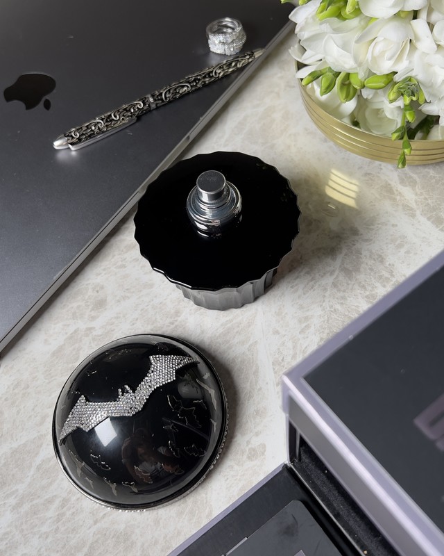 Флакон напоминает тёмный купол ночи: чёрный корпус с летучими мышами, блеск кристаллов по ободку и глубокий красный внизу, словно подсветка огней города под небом. Он выглядит не как парфюм, а как символ, знак героя.