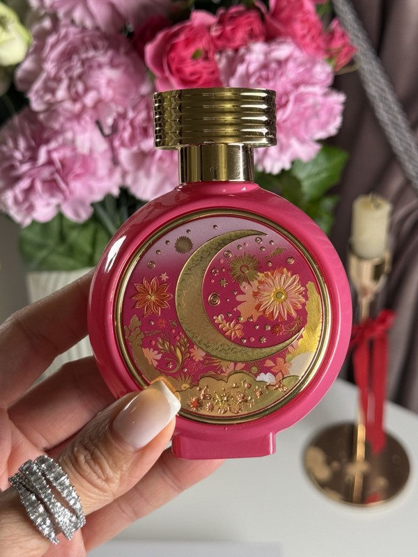 Флакон — настоящее произведение искусства: розовый лак, позолоченные детали, на лицевой стороне — полумесяц среди фантазийных цветов. Всё в нём напоминает восточную миниатюру, ожившую под светом ночи.