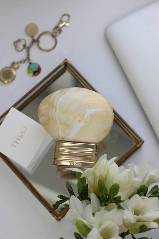 Флакон поражает воображение. Его форма напоминает округлый камень, а поверхность покрыта золотыми и белыми прожилками, словно застывший поток карамели. На золотистом основании флакон выглядит как арт-объект, часть коллекции, достойная витрины.